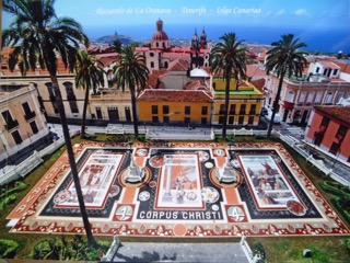 Der Rathausplatz von La Orotava wird von einem künstlerischen „Teppich“ aus Erde in verschiedenen Farben von der Hochebene des Teide überzogen und in der Mitte des Platzes wird ein silberner Thron zur Anbetung Christi aufgestellt.